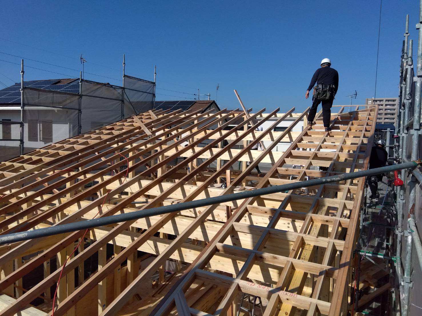 基礎だけだった現場に、柱・梁・棟木が次々と組み上がり、